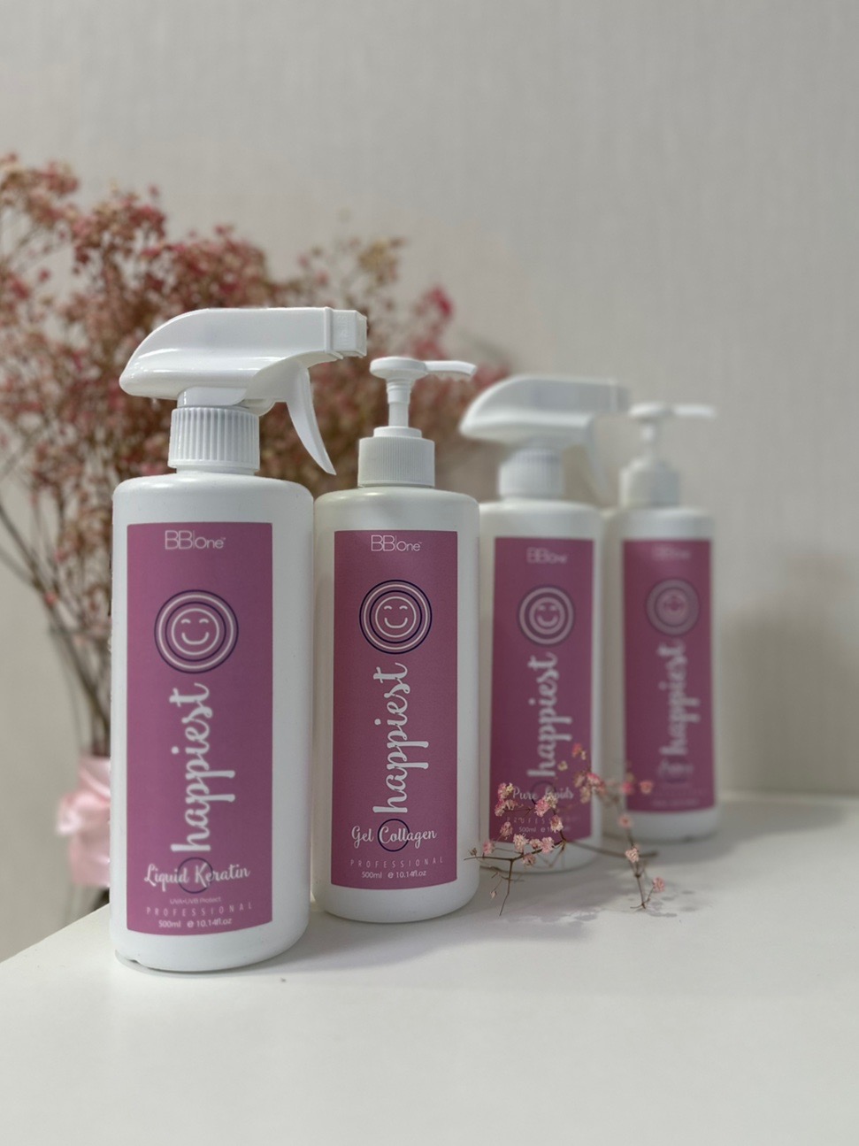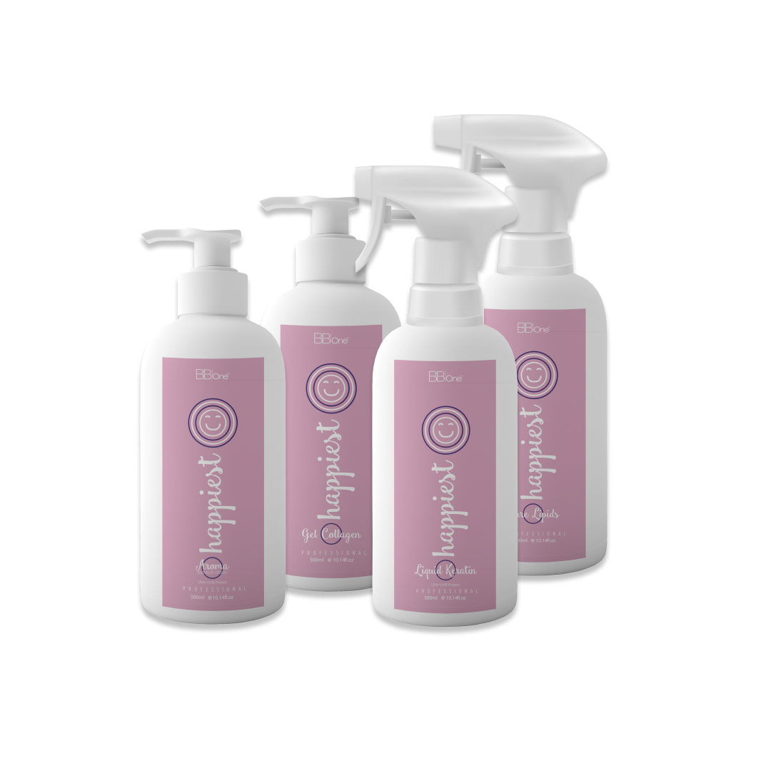 BB One Happiest призначений для холодного відновлення волосся у 4 етапи (Холодний ботокс волосся). Набір містить кератин, ліпіди, колаген та незмивну маску високого зволоження. Підходить для всіх типів волосся. Органічний кератин ущільнює та зміцнює волосся зсередини, колаген надає їм еластичність, ліпіди зміцнюють зовнішній і кутикулярні шари, захищаючи волосся. Фінальний крок набору – незмивна маска, має потужний сонцезахисний ефект, що перешкоджає вбирання сторонніх запахів і оберігає волосся від негативних факторів довкілля .