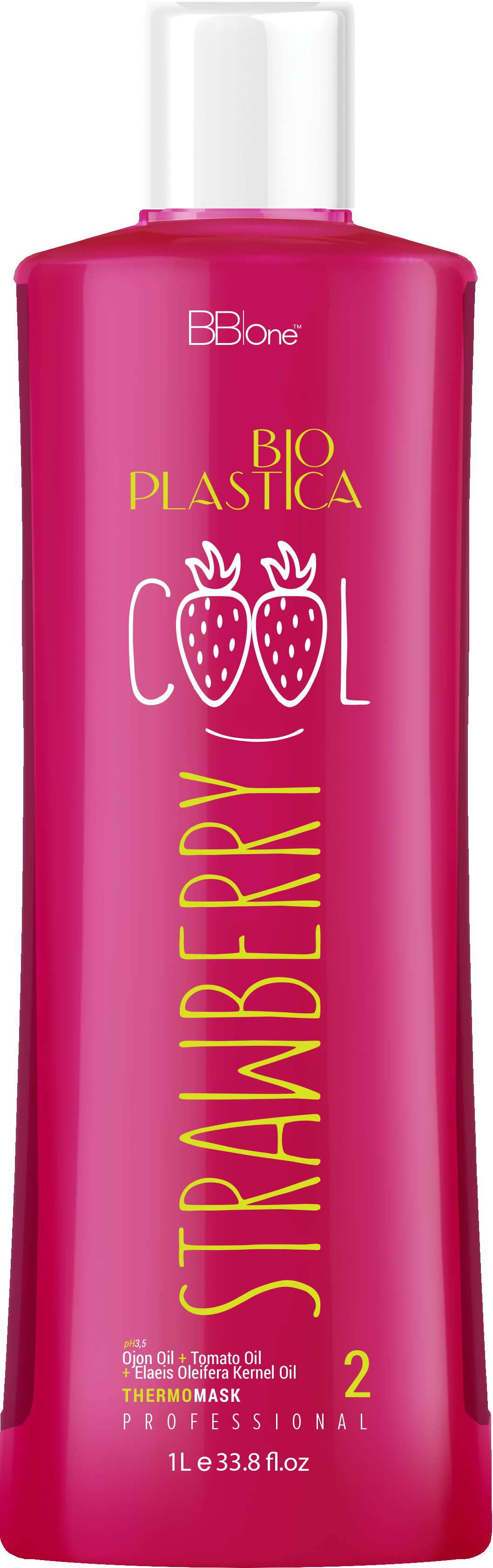 БіоПластика Cool Strawberry Thermo Mask крок 2 має pH 3,5, містить олії та амінокислоти, завдяки чому ідеально підходить для слов’янського типу волосся. Підходить для кучерявого, хвилястого, неслухняного, пухнастого та тонкого волосся, а також для волосся змішаного типу. Успішно працює з пофарбованим і освітленим волоссям низьким, середнього та високого ступеня пошкодження. М’яко та дбайливо випрямляє, живить і зміцнює волосся, усуває пухнастість, надає блиску і фіксує укладку. Дія: 4-6 місяців Активні інгредієнти: гідролізований кератин, олія жотон, екстракти полуниці, тамаринда та зародків пшениці, олія томата, олія Ши, олія жожоба. Не містить формальдегіду, не жирнить волосся. Час витримки — до 10 хвилин.