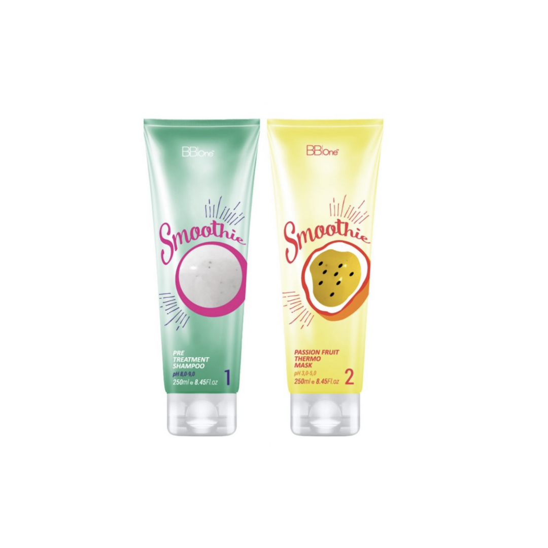 БіоПластика Smoothie Passion Fruit Thermo Mask крок 2 має pH 3,5, містить олії та амінокислоти, завдяки чому ідеально підходить для слов’янського типу волосся. Підходить для кучерявого, хвилястого, неслухняного, пухнастого та тонкого волосся, а також для волосся змішаного типу. Успішно працює з пофарбованим і освітленим волоссям низького, середнього та високого ступеня пошкодження. М’яко та дбайливо випрямляє, живить і зміцнює волосся, усуває пухнастість, надає блиску і фіксує укладку. Дія: 4-6 місяців Активні інгредієнти: гідролізований кератин, олія жотон, екстракти маракуї, тамаринда та зародків пшениці, олія томата, олія Ши, олія жожоба. Не містить формальдегіду, не жирнить волосся. Час витримки — до 10 хвилин.