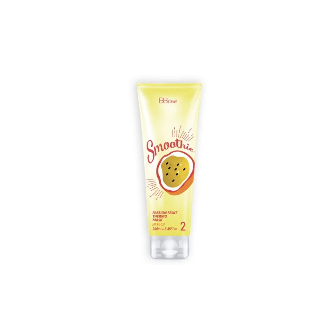 БіоПластика Smoothie Passion Fruit Thermo Mask крок 2 має pH 3,5, містить олії та амінокислоти, завдяки чому ідеально підходить для слов’янського типу волосся. Підходить для кучерявого, хвилястого, неслухняного, пухнастого та тонкого волосся, а також для волосся змішаного типу. Успішно працює з пофарбованим і освітленим волоссям низького, середнього та високого ступеня пошкодження. М’яко та дбайливо випрямляє, живить і зміцнює волосся, усуває пухнастість, надає блиску і фіксує укладку. Дія: 4-6 місяців Активні інгредієнти: гідролізований кератин, олія жотон, екстракти маракуї, тамаринда та зародків пшениці, олія томата, олія Ши, олія жожоба. Не містить формальдегіду, не жирнить волосся. Час витримки — до 10 хвилин.